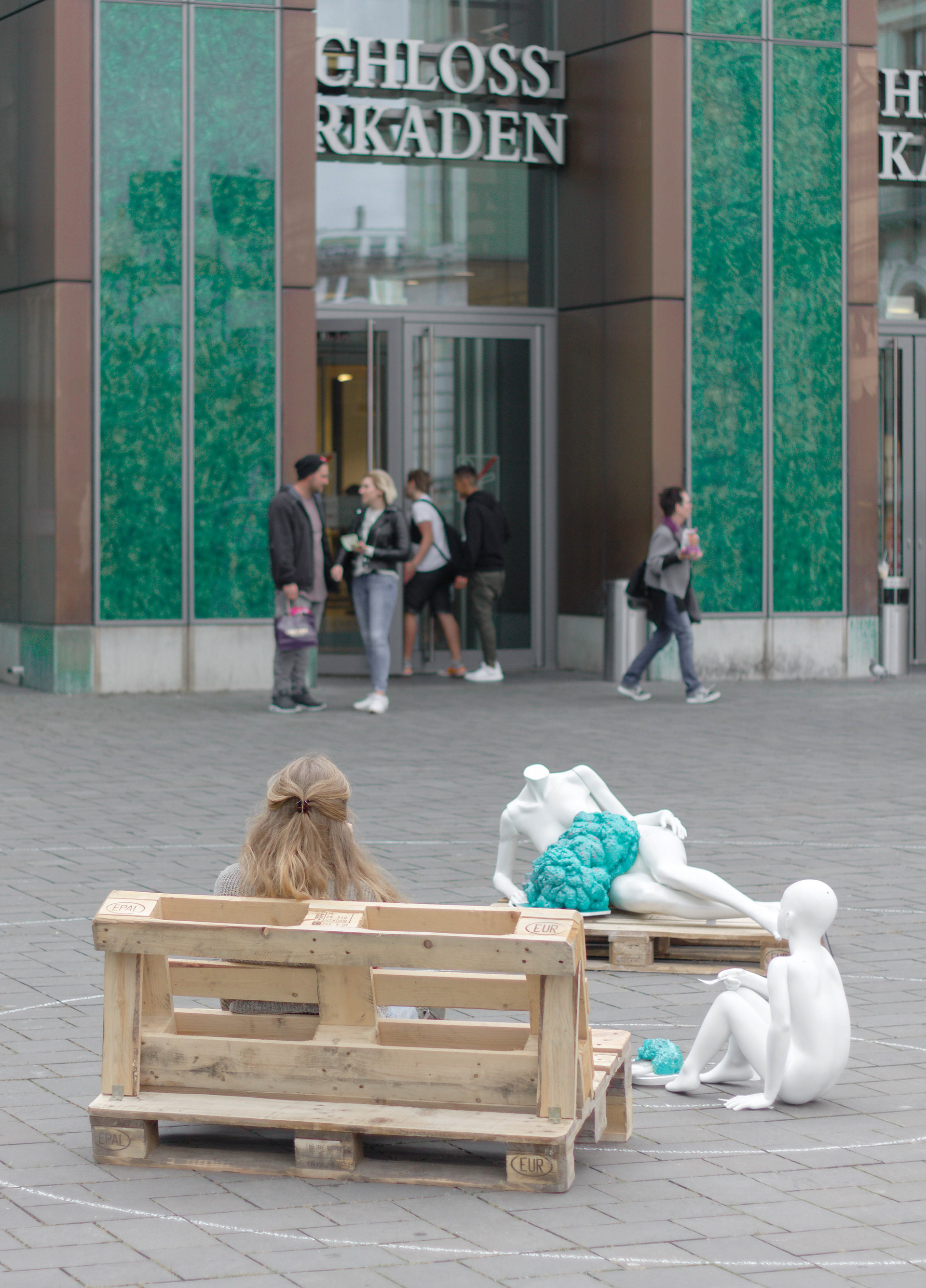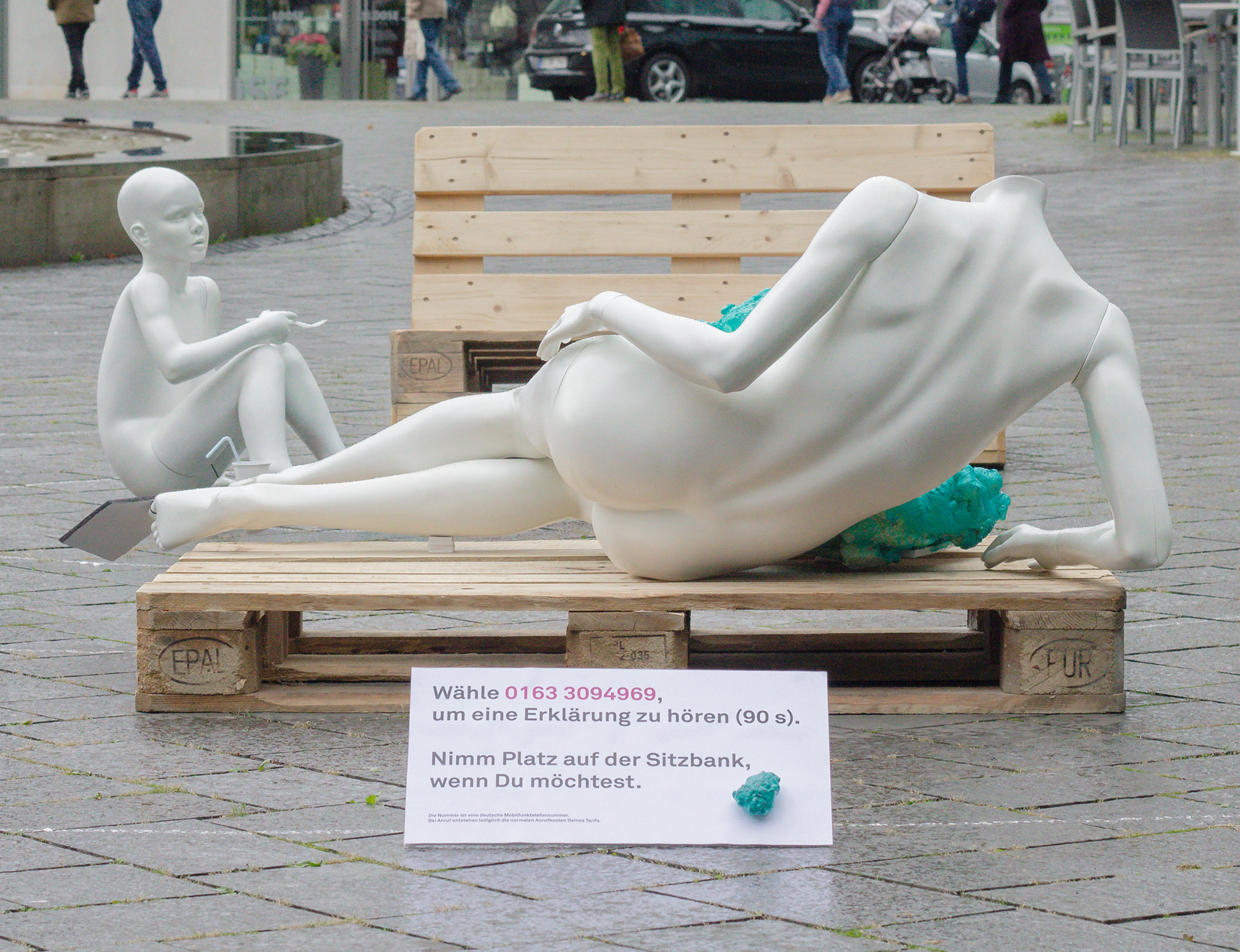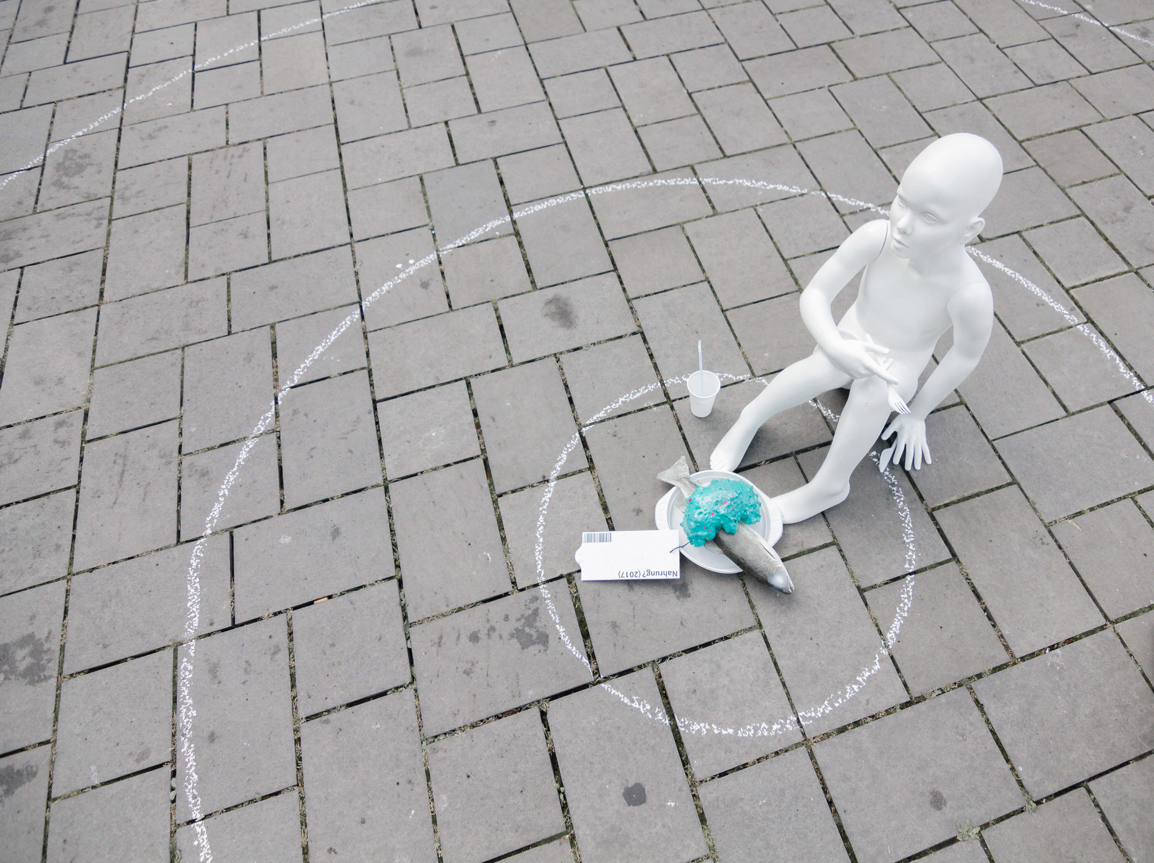 Eine weiß lackierte Kinderschaufensterpuppe sitzt auf dem Boden, bizarr einladend, sich dazu zu gesellen. Vor der Puppe befindet sich ein Teller auf dem ein Hering platziert ist, gefüllt mit Plastikpartikeln. In der rechten Hand hält die Puppe eine Gabel und in der linken ein Messer. Am Fisch ist ein Preisschild mit folgendem Text befestigt: Nahrung? (2017). Der Teller stellt das Zentrum mehrerer konzentrischer Kreisen dar, die sich großflächig auf dem Boden abzeichnen. Eine zweite weiß lackierte Schaufensterpuppe liegt auf einer alten Europalette. Die Puppe besitzt keinen Kopf. Aus dem Bauch quillt eine undefinierbare Masse in greller Farbe heraus, welche mit vielen kleinen Partikeln versehen ist. Am Fuß der Puppe ist ein Namensschild befestigt, das an ein Identifikationsschild einer Leiche erinnert. Darauf befindet sich folgender Text: Wal? (2018). Um den Aufbau herum befinden sich mehrere Informationsschilder mit der Einladung zum Verweilen auf einer bereitgestellten Sitzbank, sowie dem Hinweis auf eine eigens eingerichtete automatisierten Hotline, die weitere Informationen zur Intervention bereithielt und dazu aufforderte einen Kommentar auf der Mailbox zu hinterlassen.