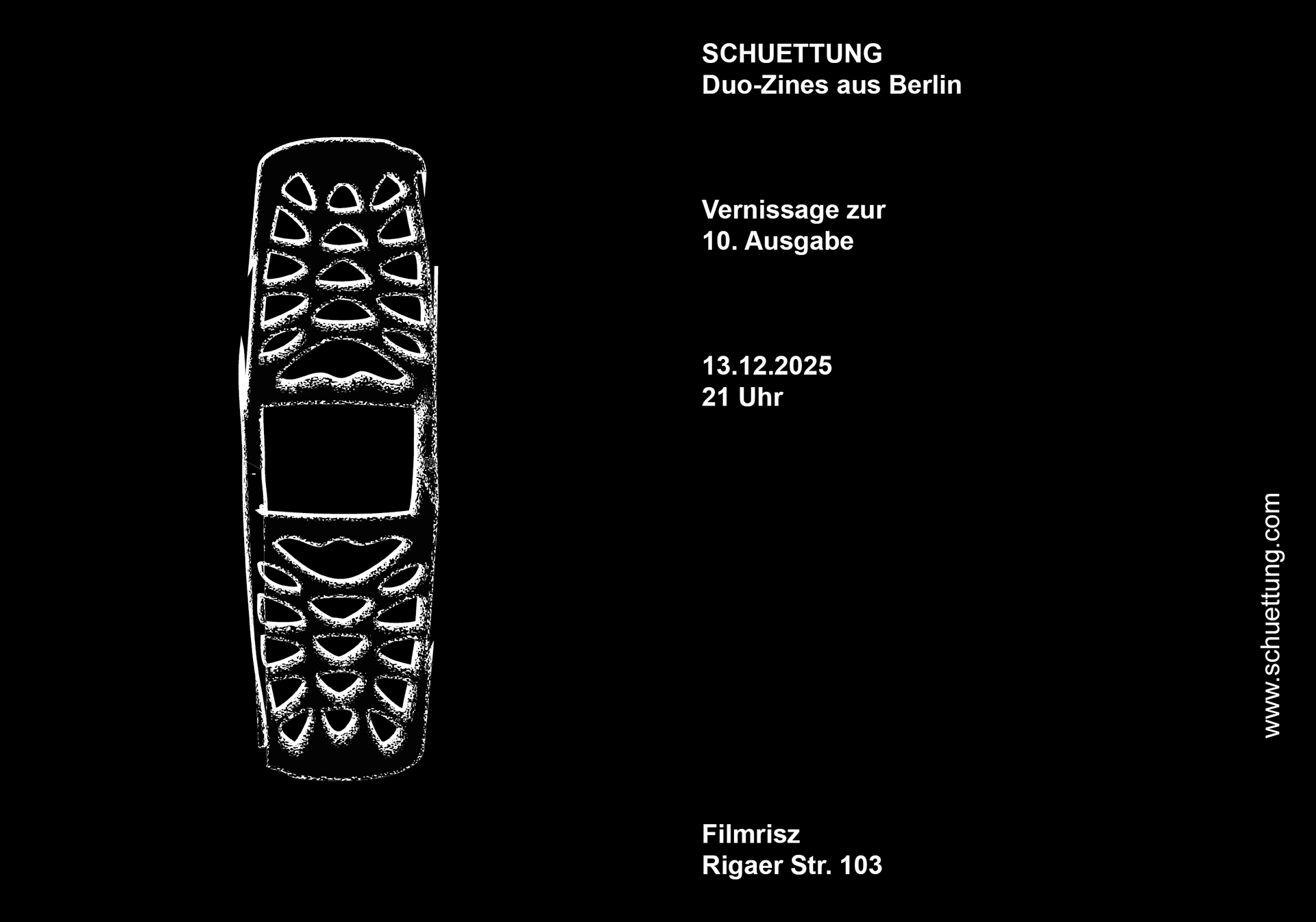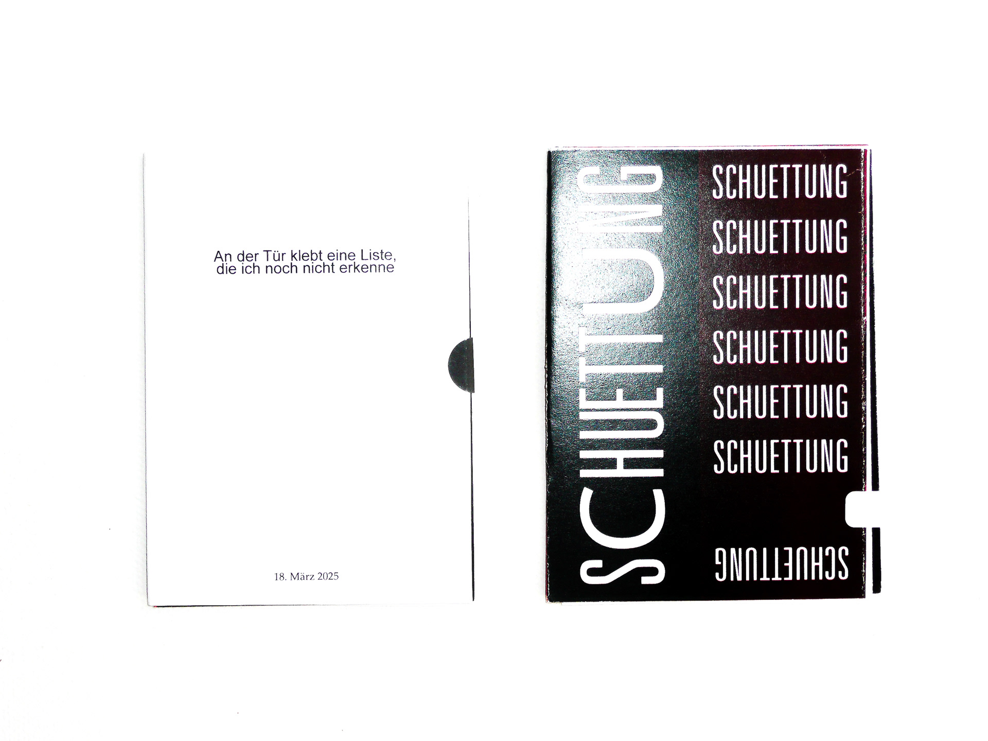 SCHUETTUNG ist eine limitierte Zine-Reihe aus Berlin. Die Kleinmagazine entstehen durch eine Kombination aus Écriture automatique und der Round Robin Methode. Die abgedruckten Texte verstehen sich als Schreibübung. Nachträglich zensierende Korrekturen sind nicht notwendig. Jedes Zine besteht aus zwei Geschichten, die parallel und dennoch unabhängig voneinander entstehen. Das Layout erfolgt gemeinsam, wechselseitig, ist schnell und roh. Anschließend kann darüber gesprochen werden. Danach werden die Zines verschenkt und verloren. SCHUETTUNG untersucht assoziative Schreibmethoden, metaphorische Text-Bild-Bezüge und typografische Experimente.