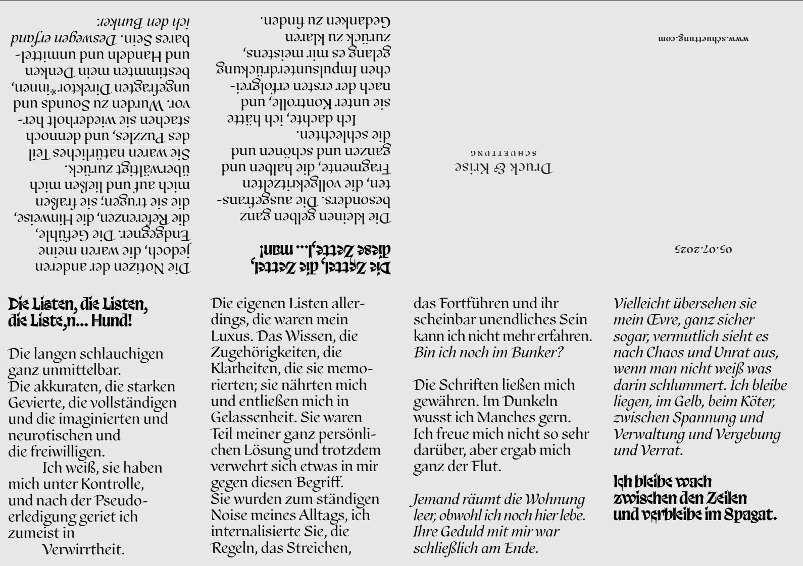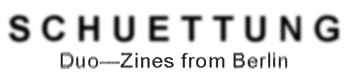 S C H U E T T U N G ist eine limitierte Zine-Reihe aus Berlin. Die Kleinmagazine entstehen durch eine Kombination aus Écriture automatique und der Round Robin Methode. Die abgedruckten Texte verstehen sich als Schreibübung. Nachträglich zensierende Korrekturen sind nicht notwendig. Jedes Zine besteht aus zwei Geschichten, die parallel und dennoch unabhängig voneinander entstehen. Das Layout erfolgt gemeinsam, wechselseitig, ist schnell und roh. Anschließend kann darüber gesprochen werden. Danach werden die Zines verschenkt und verloren. S C H U E T T U N G untersucht assoziative Schreibmethoden, metaphorische Text-Bild-Bezüge und typografische Experimente.